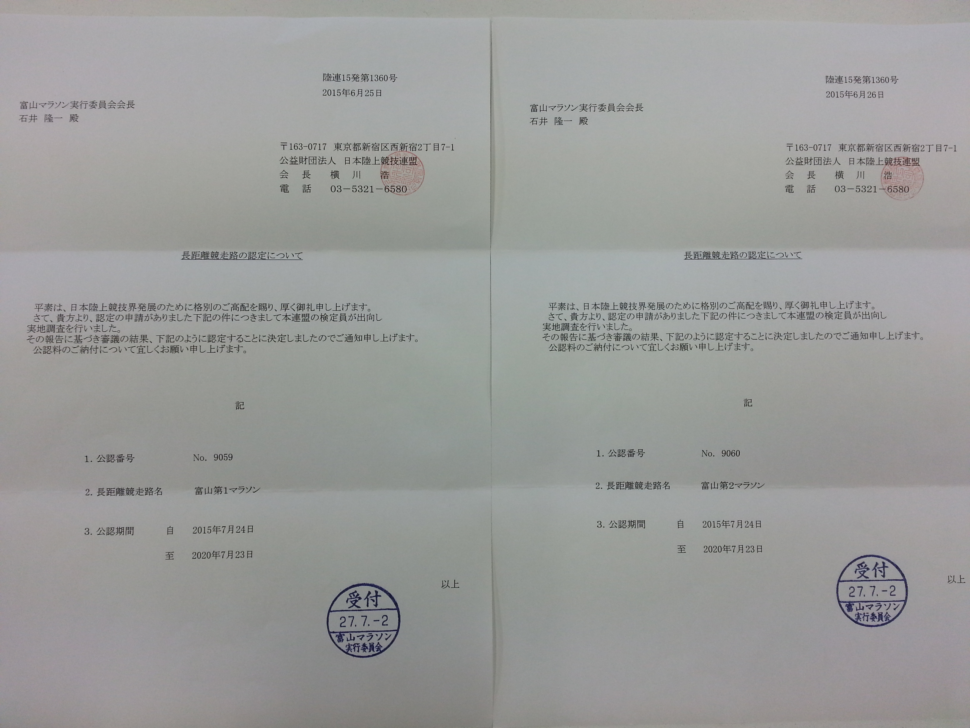 兼ねてから準備を進めておりました、公認コースについて、本日、日本陸上競技連盟から認定する旨文書が届きました。これにより富山マラソンは公認コースとなり、公認大会として開催することとなりましたのでお知らせいたします。