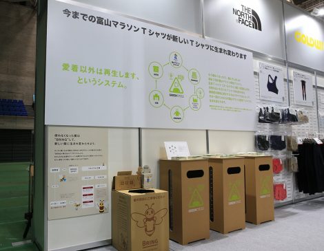 貴社は、2009年から衣服の循環型リサイクルシステム「GREENCYCLE」※1に取り組んでおり、不要になった衣服の回収を実施しています。「富山マラソンEXPO2019」で回収したTシャツは、「GREENCYCLE」の仕組みを活用し、当社提携会社が仕分けし、複数の工程を経て新たな繊維に再生され、ゴールドウインの新たな製品となります※2。