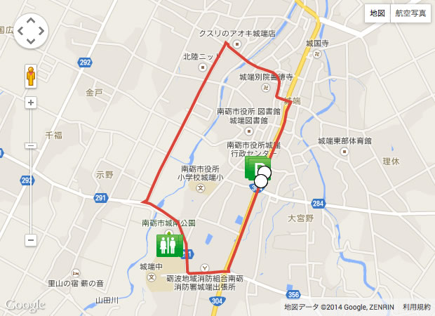 | スタート地点の最寄り施設 | 南砺市役所城端行政センター 住所:南砺市城端1046 電話:0763-62-1212 |