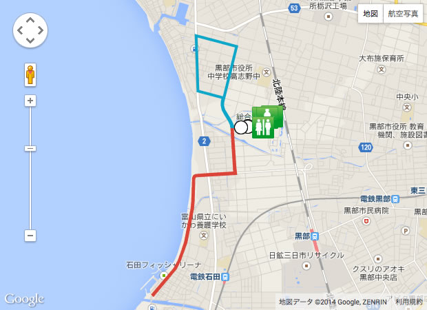 | スタート地点の最寄り施設 | 黒部市総合体育センター 住所:黒部市堀切1142 電話:0765-57-2300 |